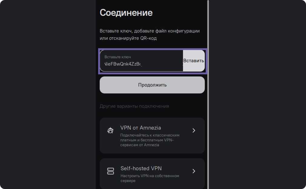 Скопируйте ключ из источника и вставьте в самую первую строку. Amnezia поддерживает ключи в форматах JSON (протоколы ShadowSocks, VLESS, VMESS, Reality,) .conf, .ovpn, .vpn