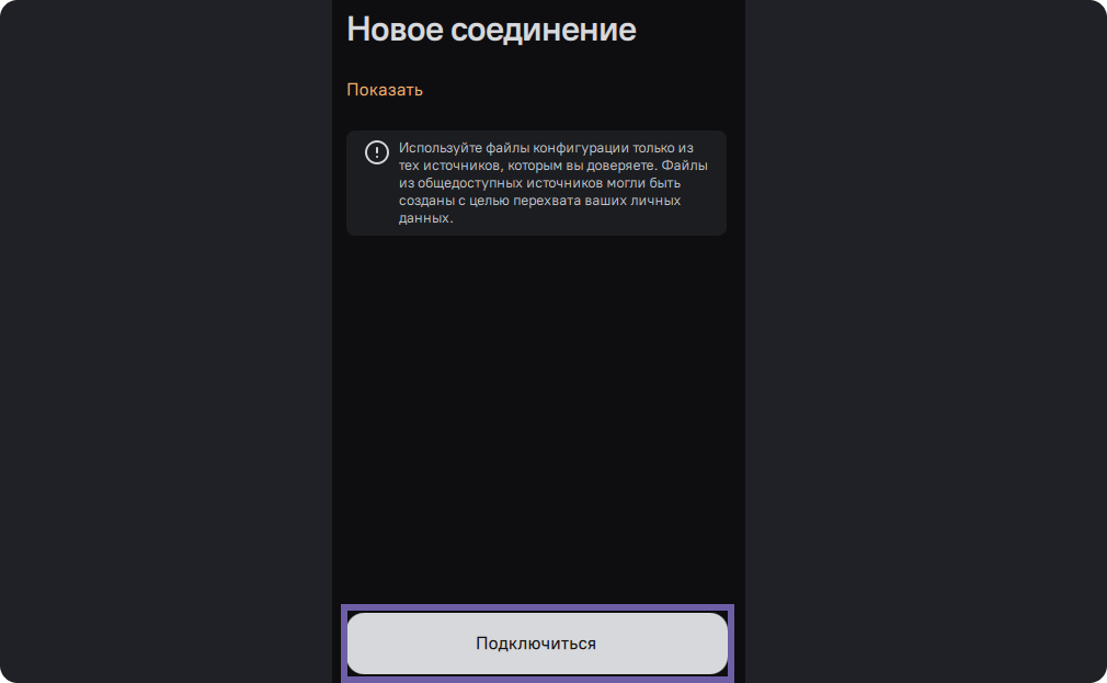 На этом экране вы можете посмотреть содержимое ключа при нажатии на слово "Показать". Далее кликните “Подключиться”.