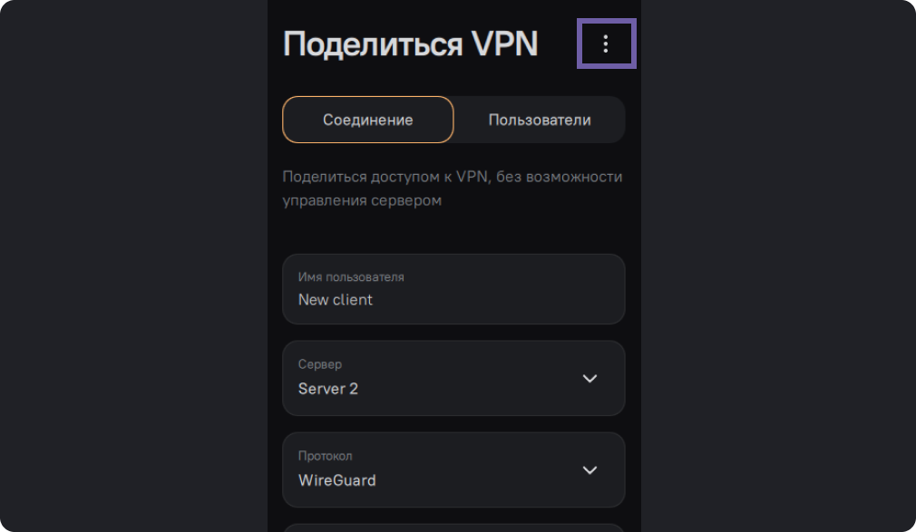Приложение предложит поделиться полным доступом к VPN, нажмите “Поделиться”. Далее убедитесь, что выбран нужный сервер и нажмите "Поделиться".