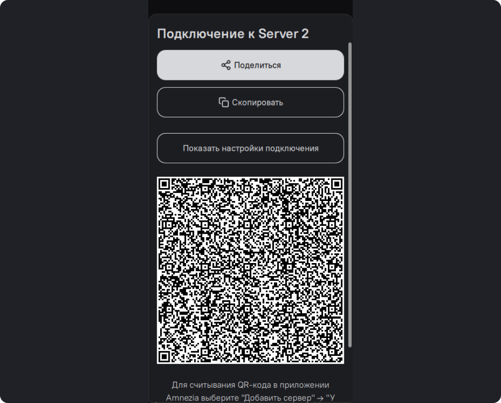 - Нажмите “Поделиться”, чтобы скачать файл конфигурации себе на устройство. Если вы делитесь с помощью QR-кода, отсканируйте его с помощью смартфона или планшета.