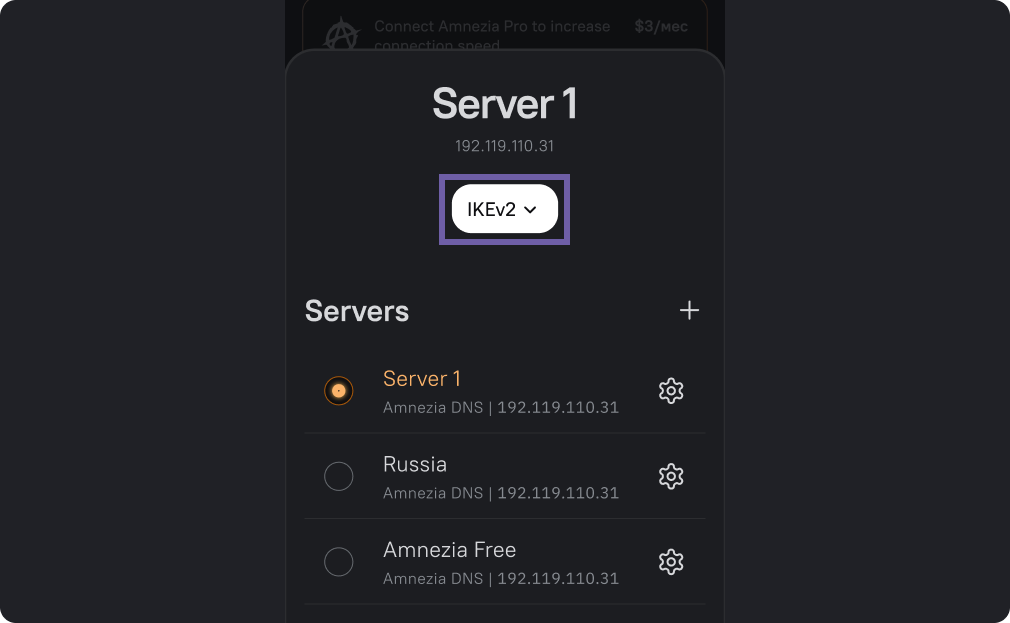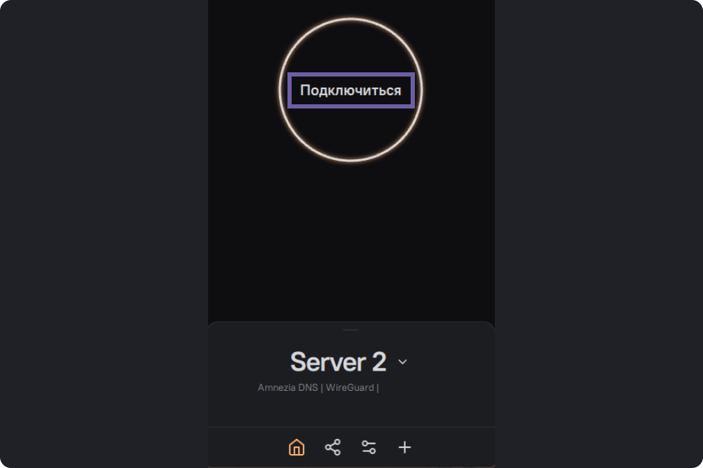 Откройте приложение Amnezia. На главном экране внизу кликните на название вашего сервера (на скриншоте он обозначен как Server2).
