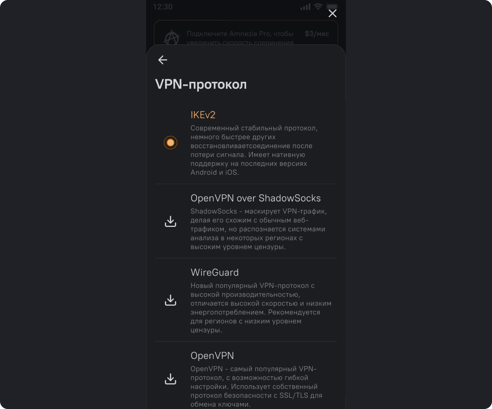 Amnezia - мультипротокольный клиент и поддерживает почти все современные протоколы: OpenVPN, WireGuard, ShadowSocks IKv2 и OpenVPN с плагином Cloak, более подробно о протоколах вы можете прочитать в описании протоколов.