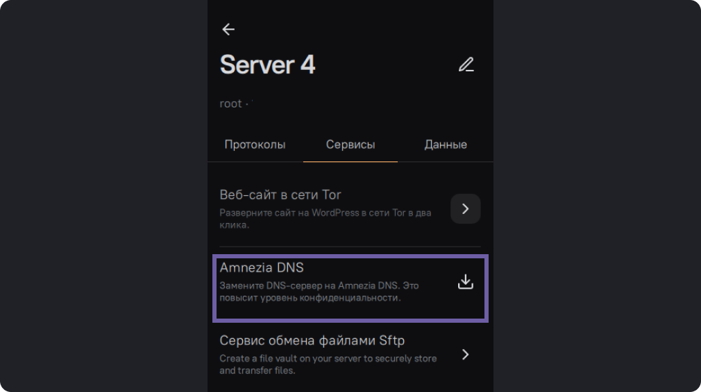 Выберите вкладку "Сервисы", далее Amnezia DNS.