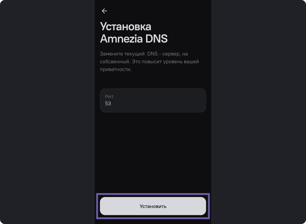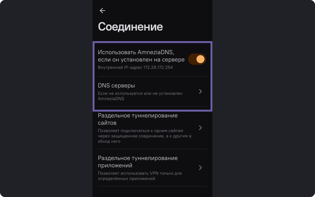 Здесь вы сможете выбрать опцию “Использовать Amnezia DNS”, или использовать другие DNS серверы.