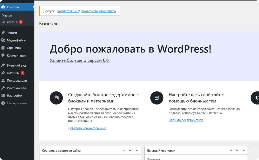 Вы зашли в консоль для создания сайтов с помощью конструктора WordPress, более подробную информацию по созданию сайтов на WordPress вы найдете на официальном сайте WordPress .