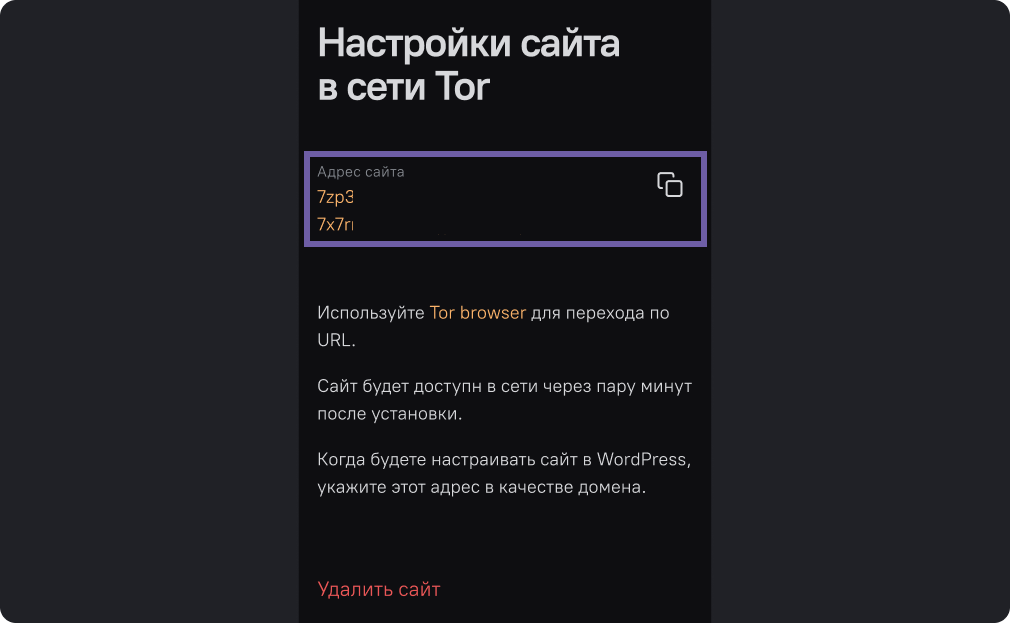 После успешной установки вы увидите адрес сайта, его нужно скопировать и вставить в строку браузера Tor.