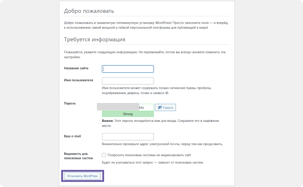 Придумайте название Сайта, введите имя пользователя, а так же Ваш e-mail, не забудьте сохранить пароль для входа. Нажмите “Установить WordPress”
