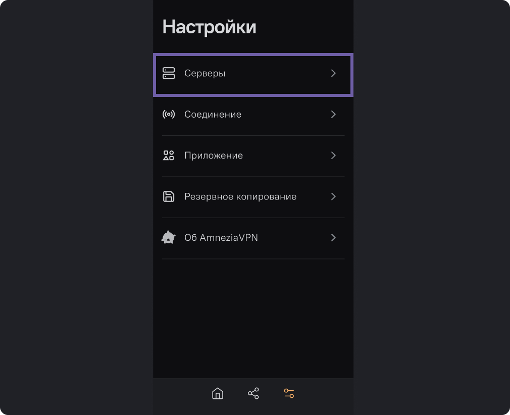 Откройте главный экран Amnezia. Внизу кликните на значок настроек.