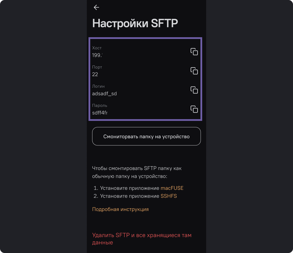 С помощью этих данных можно получить доступ к файловому хранилищу через любой SFTP-клиент.