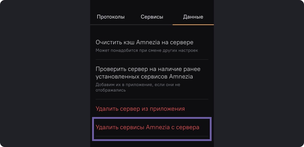 Выберите вкладку “Данные”. Выберете “Удалить сервисы Amnezia с сервера”.