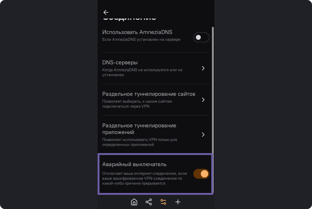Найдите - “Аварийный выключатель” . Если свитчер включен, то приложение автоматически отключит вас от сети, если VPN-соединение прервется. Если свитчер выключен, то при потере соединения с VPN вы автоматически подключитесь к сайту с вашего настоящего IP-адреса.