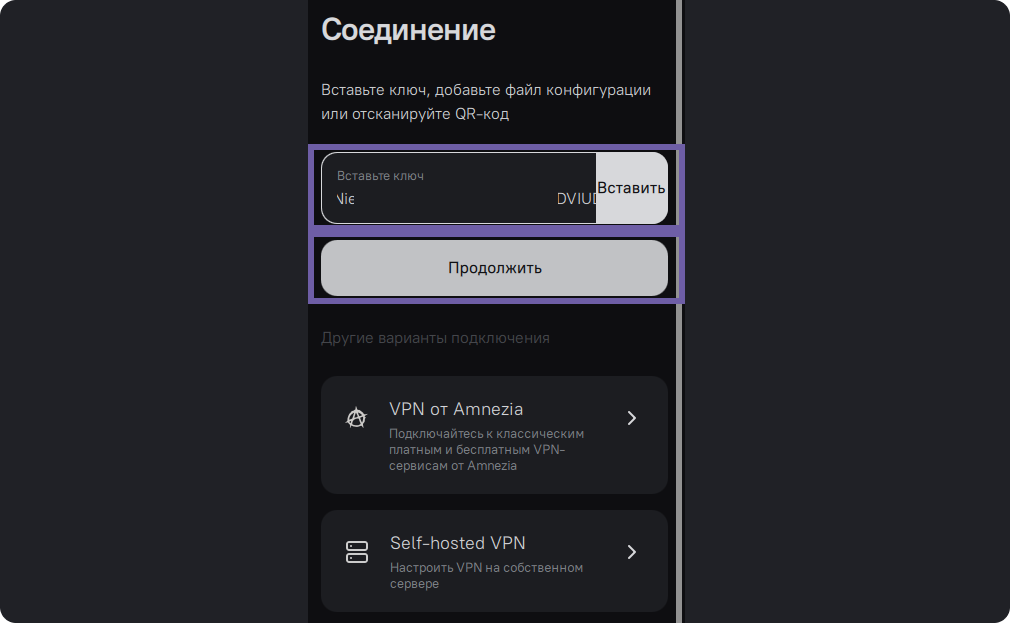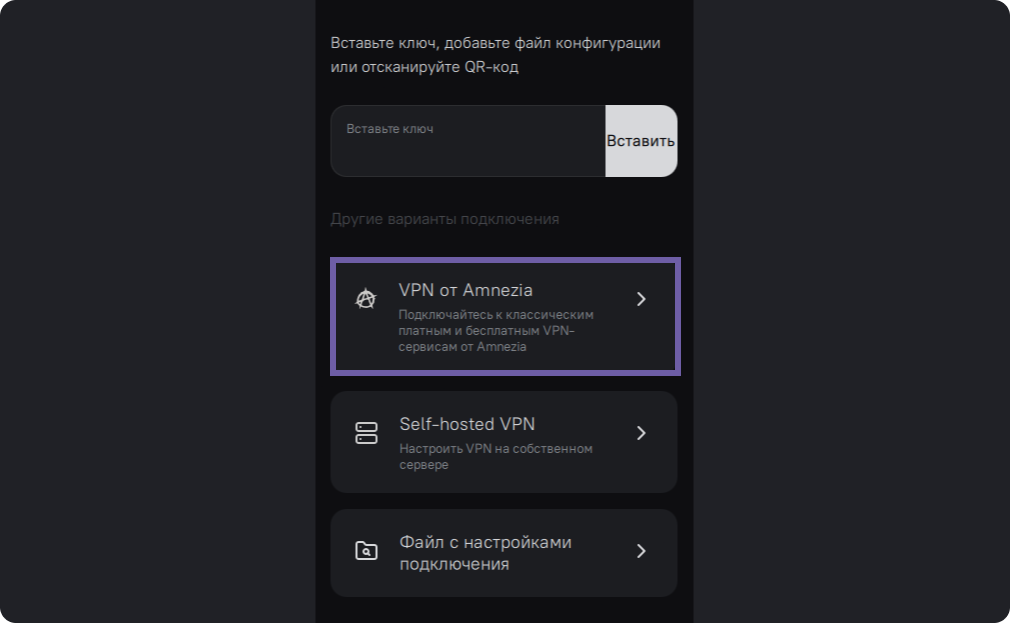 Если у вас уже включен VPN (от Amnezia или любой другой), во время первого подключения к AmneziaFree обязательно отключитесь от него, чтобы сервис мог выдать вам конфигурацию для вашего региона"