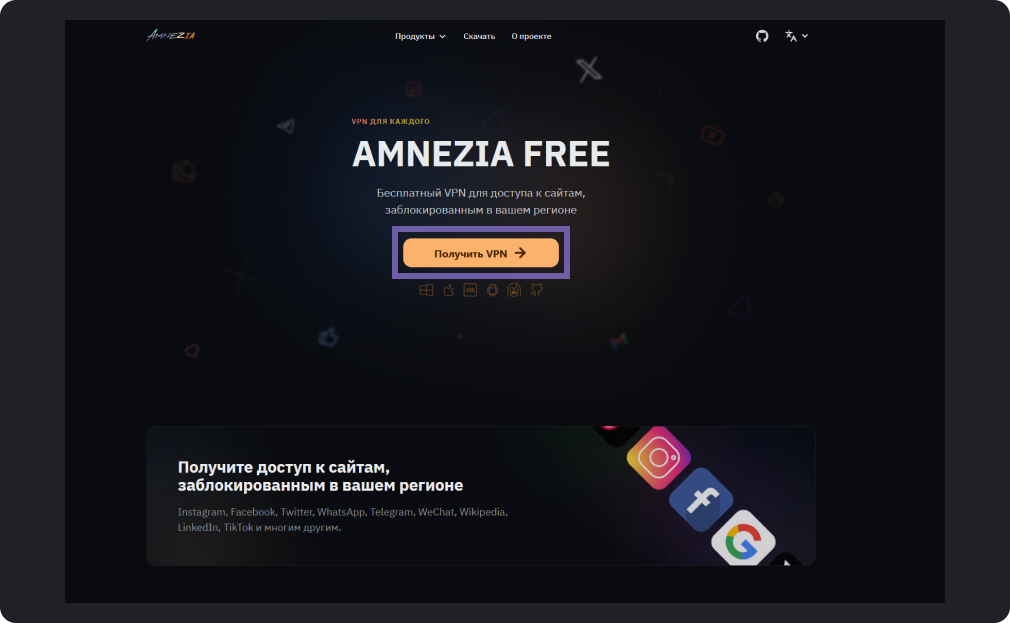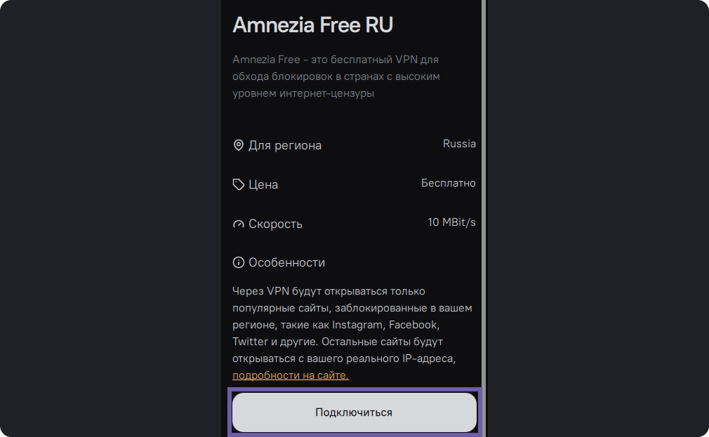 Amnezia Free- это бесплатный VPN-сервис дял обхода блокировок в конкретном регионе, более подробно можно почитать на страничке - AmneziaFree.