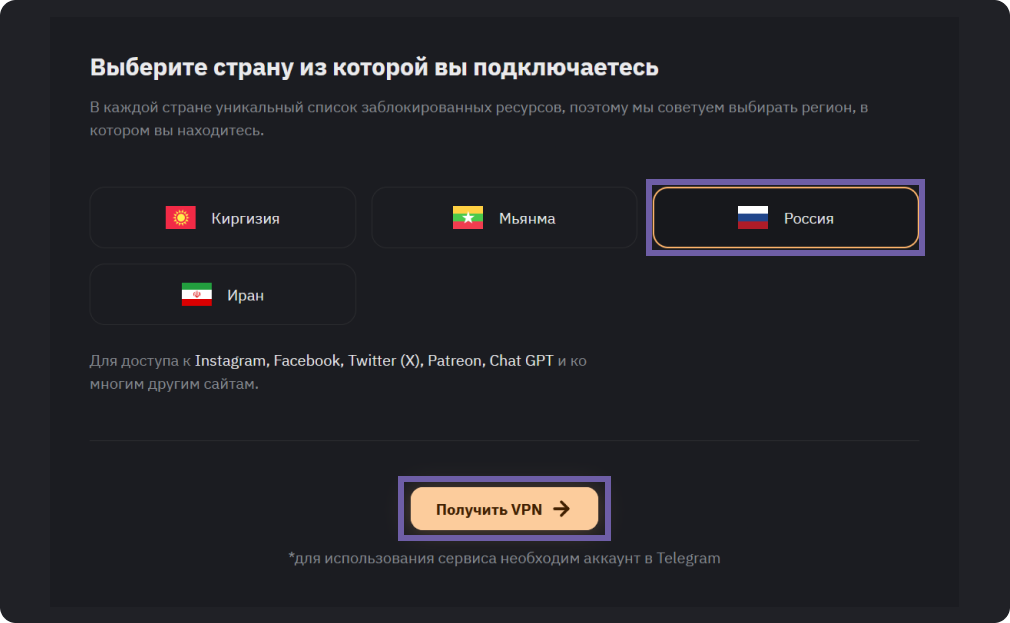 Выберите ваш регион, далее нажмите "Получить VPN",